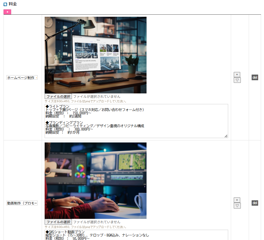 サービス料金や代金などのタイトルと画像、説明文の構成となっているページです。