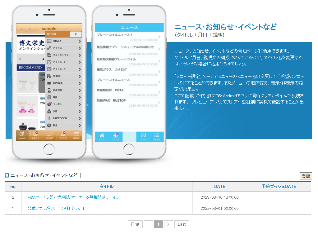 ここで記載した内容はIOS・Androidアプリに同時にリアルタイムで反映されます。「プレビューアプリ」でストアー登録前に実機で確認することが出来ます。